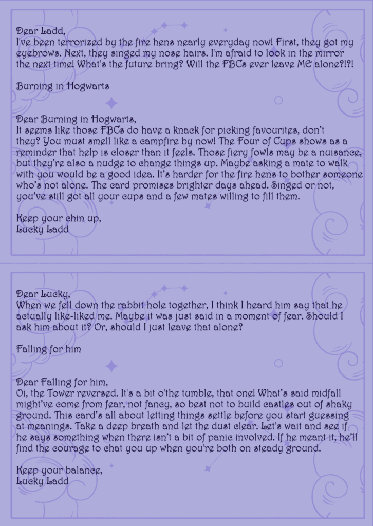 It seems like those FBCs do have a knack for picking favourites, don’t they? You must smell like a campfire by now! The Four of Cups shows as a reminder that help is closer than it feels. Those fiery fowls may be a nuisance, but they’re also a nudge to change things up. Maybe asking a mate to walk with you would be a good idea. It’s harder for the fire hens to bother someone who’s not alone. The card promises brighter days ahead. Singed or not, you’ve still got all your cups and a few mates willing to fill them.