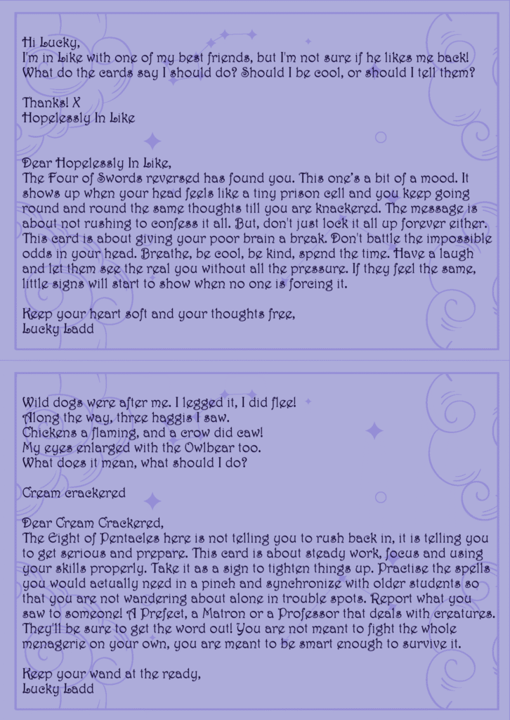 The Eight of Pentacles here is not telling you to rush back in, it is telling you to get serious and prepare. This card is about steady work, focus and using your skills properly. Take it as a sign to tighten things up. Practise the spells you would actually need in a pinch and synchronize with older students so that you are not wandering about alone in trouble spots. Report what you saw to someone! A Prefect, a Matron or a Professor that deals with creatures. They’ll be sure to get the word out! You are not meant to fight the whole menagerie on your own, you are meant to be smart enough to survive it.