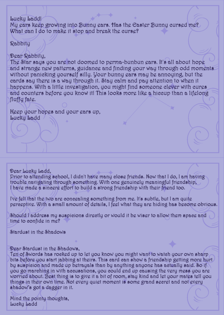Do you have a burning question about homework woes, friendship tangles or why your Transfiguration partner keeps setting things on fire? Lucky Ladd will draw the cards and lay out the answers! Don’t be shy. Your secrets are safe with me. Write Dear Lucky today and see what the cards reveal!