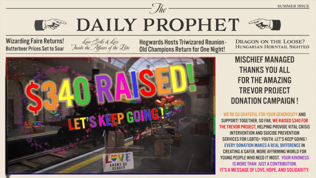 Donation updates regarding the inworld fundraising will be shared below. We raised over $200 inworld during Wizarding Faire and our donation points will remain on sim. These donations will continue to be paid directly to The Trevor Project throughout the coming years.
